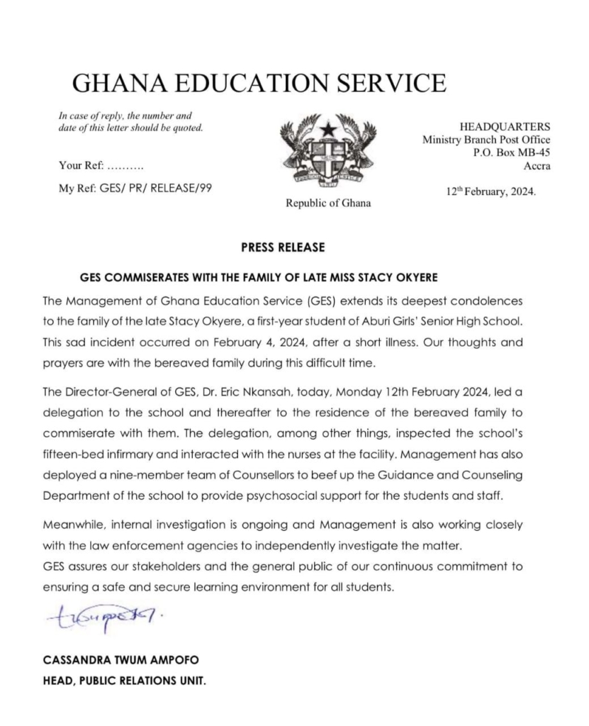 The Ghana Education Service (GES) has announced that it has launched an internal inquiry into the tragic passing of a first-year student at Aburi Girls Senior High School.