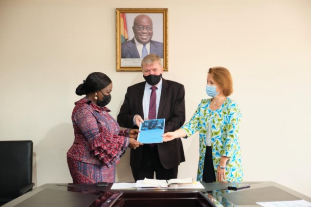 The Representative of the President at the Ministry of Sanitation and Water Resources, Cecilia Abena Dapaah, received, Mr Tom Nørring, the Ambassador of Denmark to Ghana, and Madam Anne-Claire Dufay, the UNICEF Representative in Ghana, and their teams to mark the launch of a partnership to support the national Covid-19 response by the Government of Ghana.
