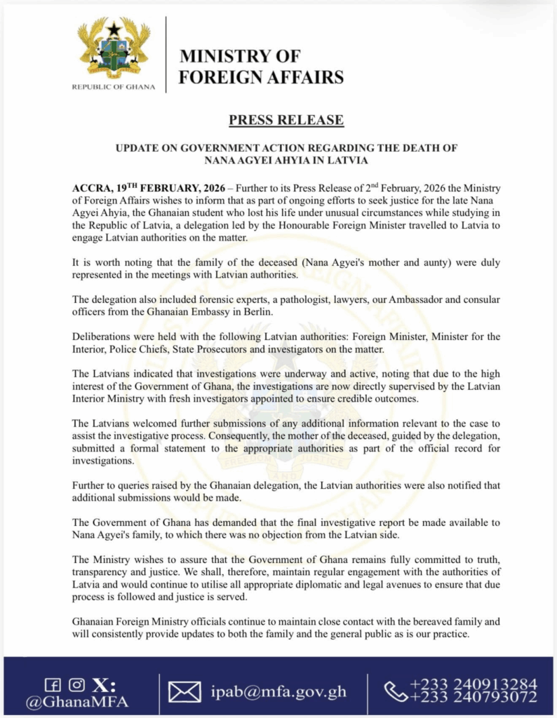 The Government of Ghana has intensified efforts to secure justice for the late Nana Agyei Ahyia, the Ghanaian student who tragically lost his life under unusual circumstances while studying in the Republic of Latvia.