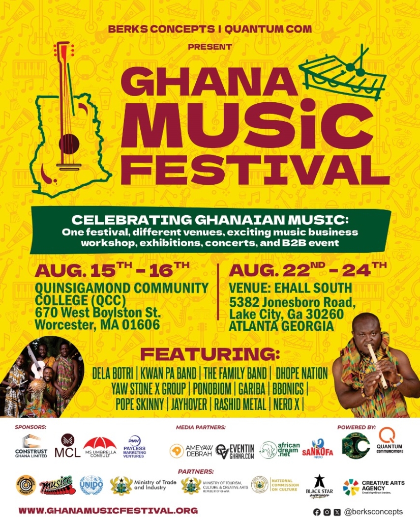 The festival will begin with an opening event in Worcester on August 15–16 at Quinsigamond Community College (QCC), featuring music workshops, live performances, and cultural showcases by renowned Ghanaian artists.