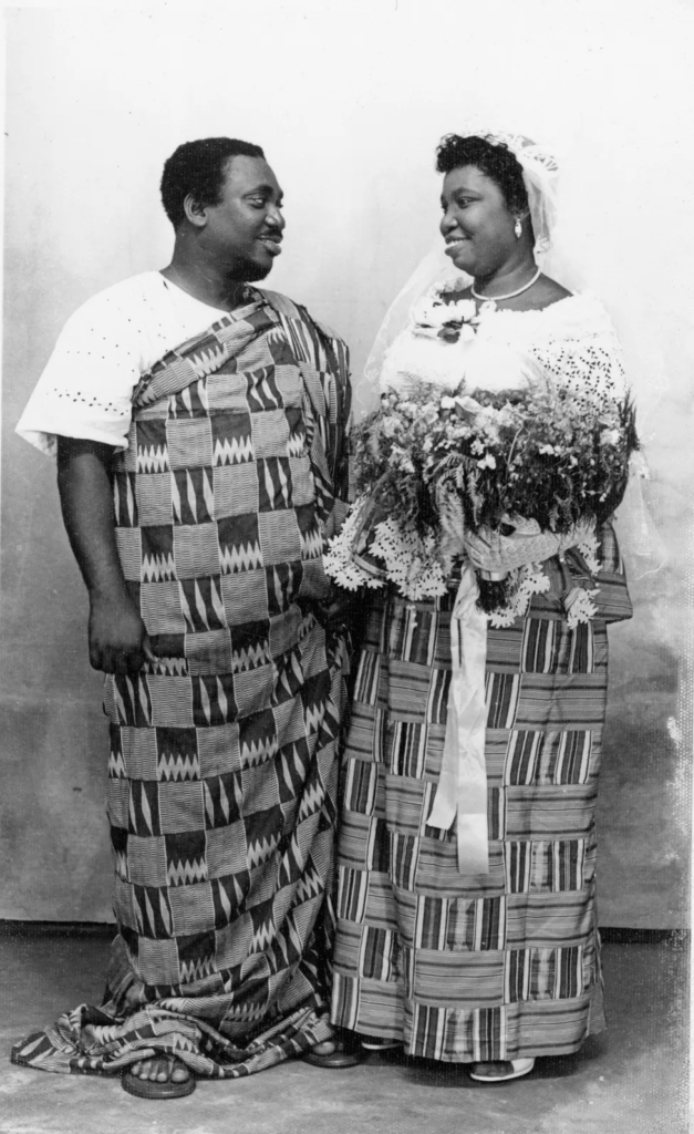 By the 1970s, the wedding clothes were still formal but the suits became more relaxed and some took to wearing traditional Ghanaian kente cloth and felt able to smile in the photograph.
