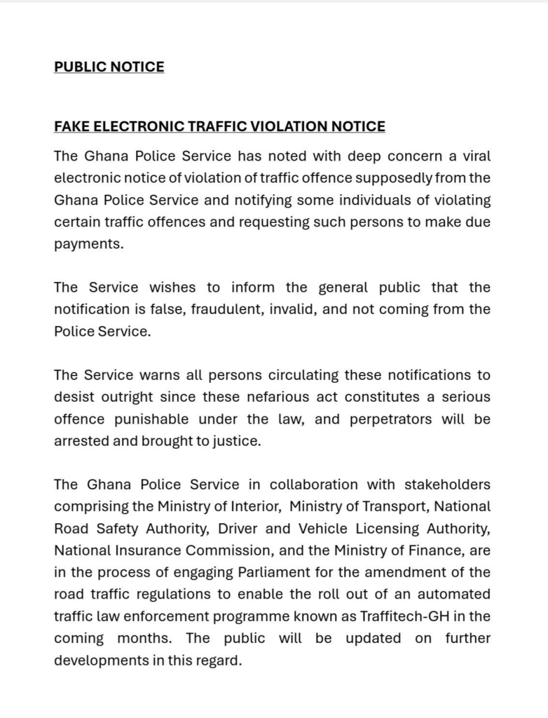 The Ghana Police Service has warned the public about a fake electronic traffic violation notice circulating online.
