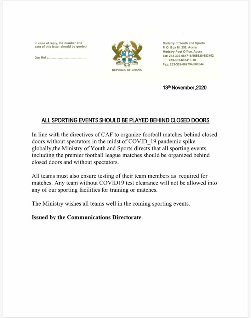 The 2020/21 Ghana Premier League games will be played behind closed doors following Ministry of Youth and Sports' decision to ban fans from attending sporting events.