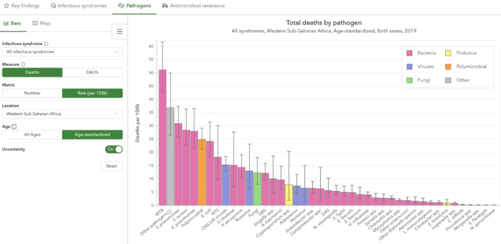 While many estimates exist for pathogens such as tuberculosis, malaria, and HIV, estimates of the disease burden of bacterial pathogens have previously been limited to a few specific pathogens and types of infection, or have been limited to specific populations.