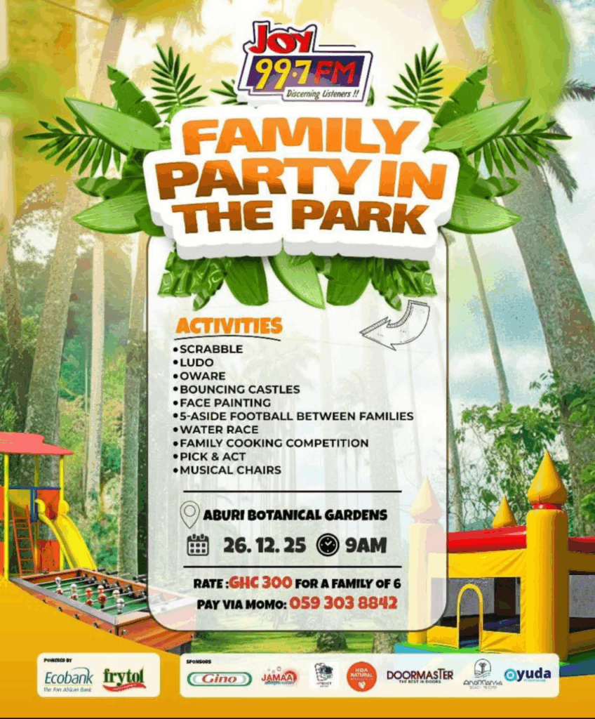 On Boxing Day, December 26, the cool hills of Aburi will come alive as the Aburi Botanical Gardens host Joy FM’s Family Party in the Park. With live performances from Kwabena Kwabena, Kwan Pa, and DopeNation, alongside cooking competitions and activities at Daddy’s Corner, the event continues its tradition of bringing families and generations together year after year.