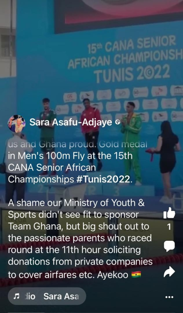 The attention of the Ghana Swimming Association (GSA) has been drawn to a Facebook post by Sara Asafu-Ajdaye, which seems to denigrate the Ministry of Youth and Sports in the wake of Ghana’s sterling performance at the just ended 15th CANA Swimming Championship in Tunisia.