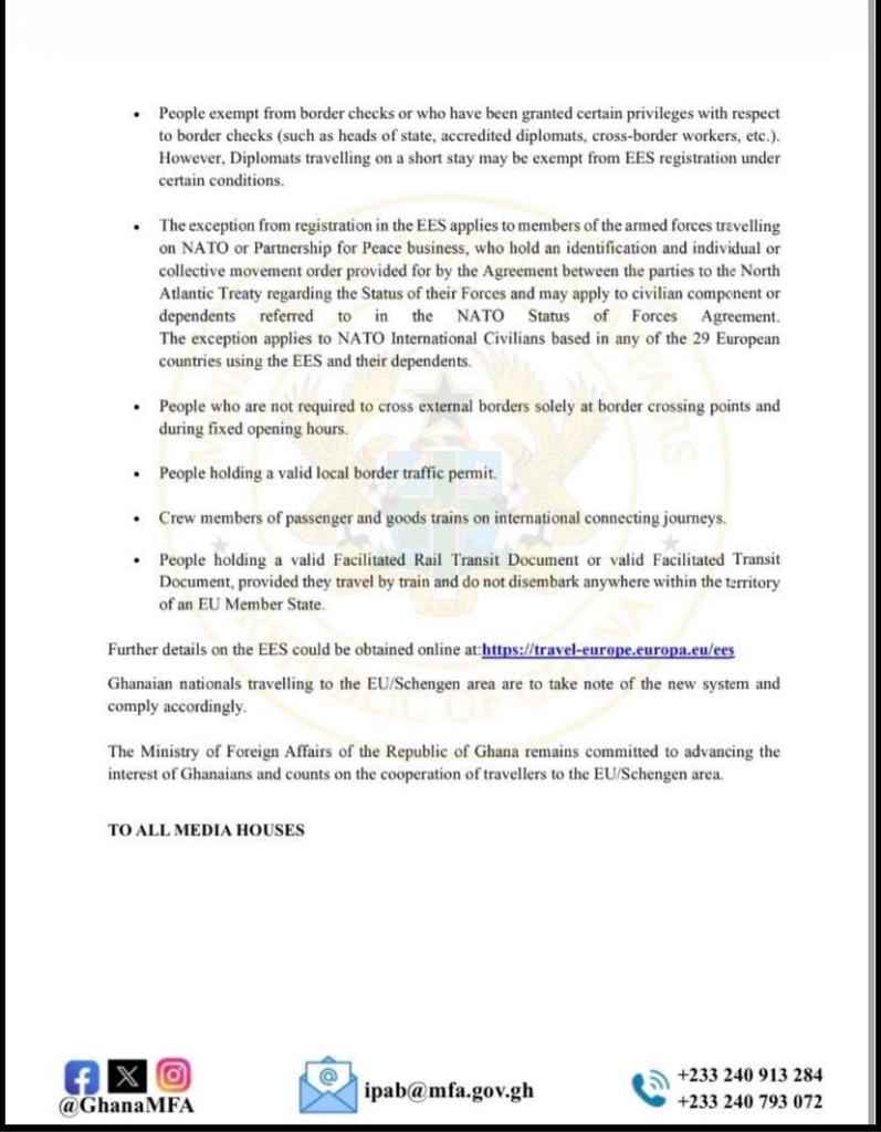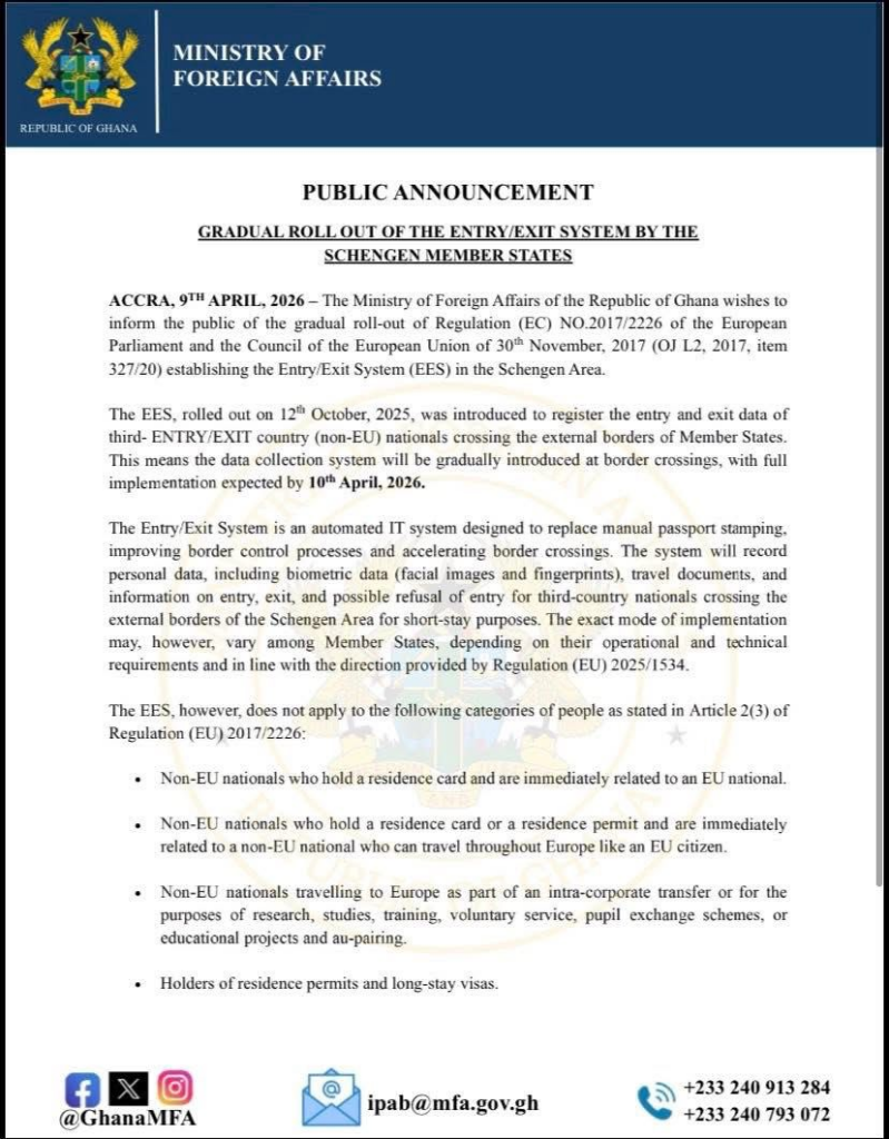 The Ministry has urged Ghanaian nationals planning travel to Europe to familiarise themselves with the new system and ensure full compliance once it becomes operational.