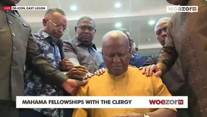 After the event, several of the religious leaders laid hands on the kneeling Mahama. Among them was the founder and leader of the Glorious Word Power Ministries International, Apostle Rev Isaac Owusu-Bempah, who has been criticised on numerous occasions for being aligned with the ruling New Patriotic Party (NPP).