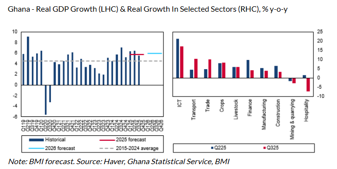 “We project economic momentum in Ghana to remain robust, with real GDP [Gross Domestic Product] growth edging up from 5.8% in 2025 to 5.9% in 2026. The latest data from Ghana Statistical Service shows that economic activity softened slightly in Q3 [quarter 3], as growth slowed to 5.5% year-on-year from 6.5% in Q2 [quarter 2]. This was largely due to weaker performance in the industrial sector, where growth fell from 2.3% in Q2 to just 0.8% in Q3, caused by a deeper contraction in mining and quarrying and easing construction activity”.