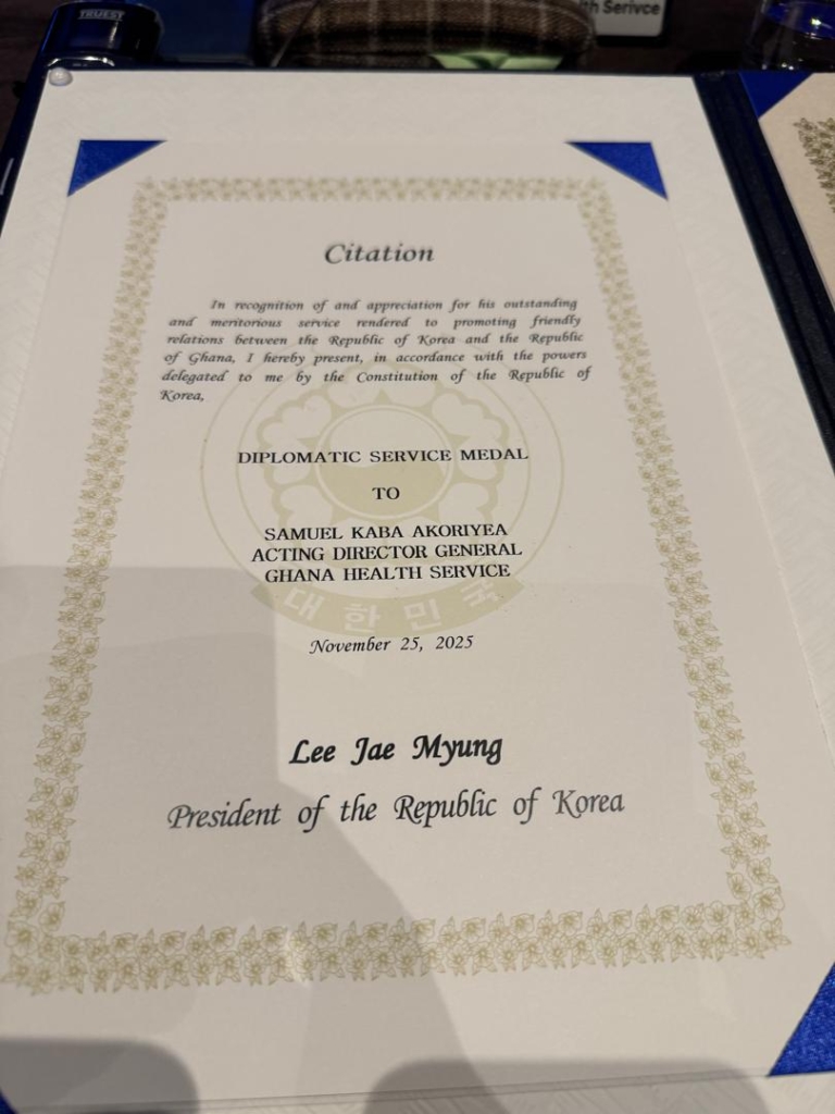 The award, presented by the Prime Minister of the Republic of Korea, Lee Jae-Myung, recognises Dr. Akoriyea’s outstanding contribution to strengthening diplomatic ties and advancing international health cooperation between Ghana and Korea.