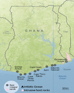 Most of the rare-earth element occurrences identified along Ghana’s coastline are likely secondary in nature, formed through the erosion and transport of REE-bearing minerals from upstream bedrock sources into coastal and near-shore environments.