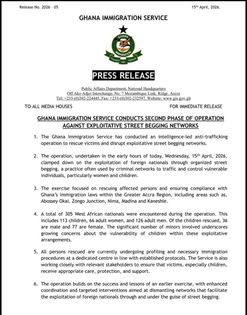 The Ghana Immigration Service (GIS) has rescued 305 West African nationals, including 113 children, in the second phase of an intelligence-led operation targeting suspected human trafficking networks operating under the guise of street begging in parts of the Greater Accra Region.