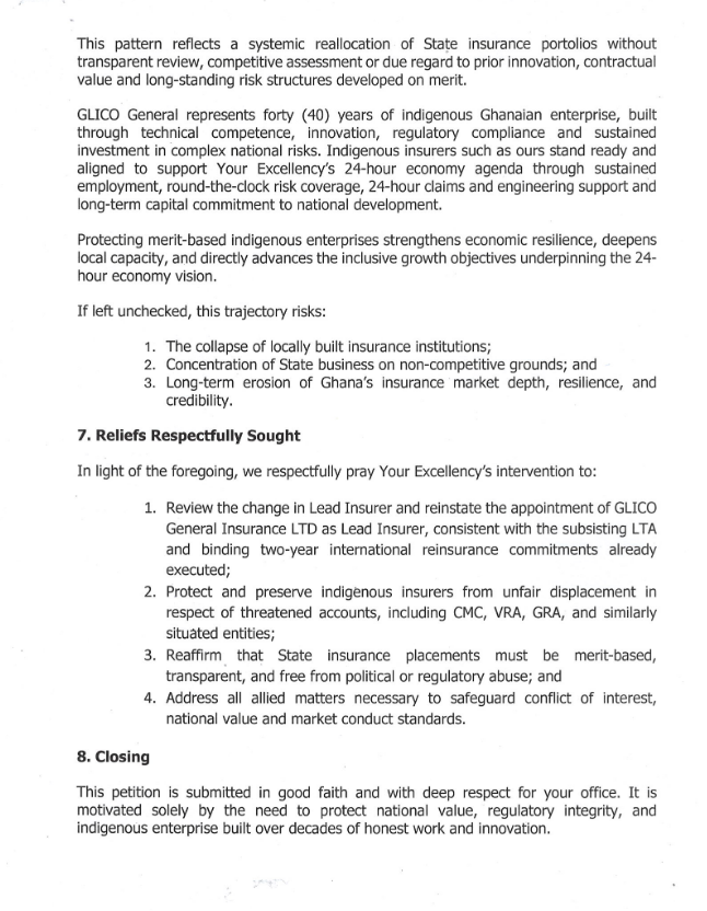 In the document addressed to the Presidency, the company outlines its grievances and argues that the issues raised have significant implications not only for GLICO General but also for confidence and stability within the insurance sector.