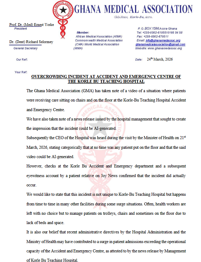 The Ghana Medical Association (GMA) has proposed sweeping reforms to Ghana’s emergency healthcare system following an overcrowding incident at the Korle Bu Teaching Hospital’s Accident and Emergency (A&E) Centre.