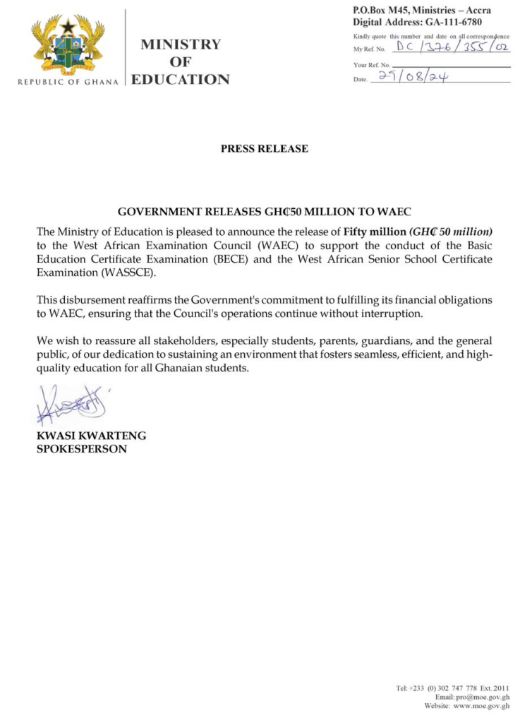 The Ministry of Education has announced the release of GH₵50 million to the West African Examination Council (WAEC) to support the administration of the upcoming Basic Education Certificate Examination (BECE) and the West African Senior School Certificate Examination (WASSCE).