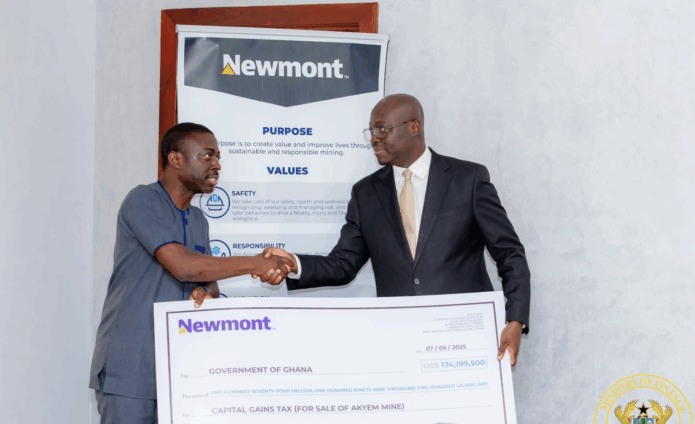 Newmont Ghana Limited has presented a Cheque for $174 million to the Government as part payment of capital gains tax following the sale of Newmont’s Akyem Mine.