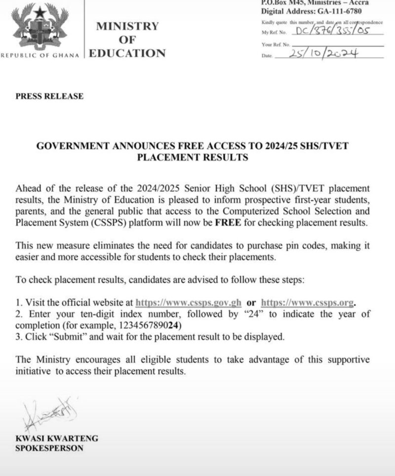 The press release, signed by Ministry Spokesperson Kwasi Kwarteng on October 25, emphasized the government’s commitment to facilitating access to education by ensuring a smooth and equitable placement process.