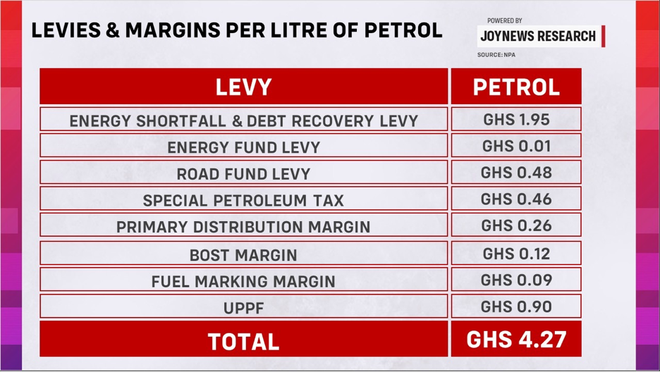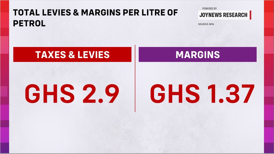 The Energy Fund Levy, Road Fund Levy and Special Petroleum Tax together bring total taxes to about GH¢2.90 per litre, while margins account for approximately GH¢1.37.