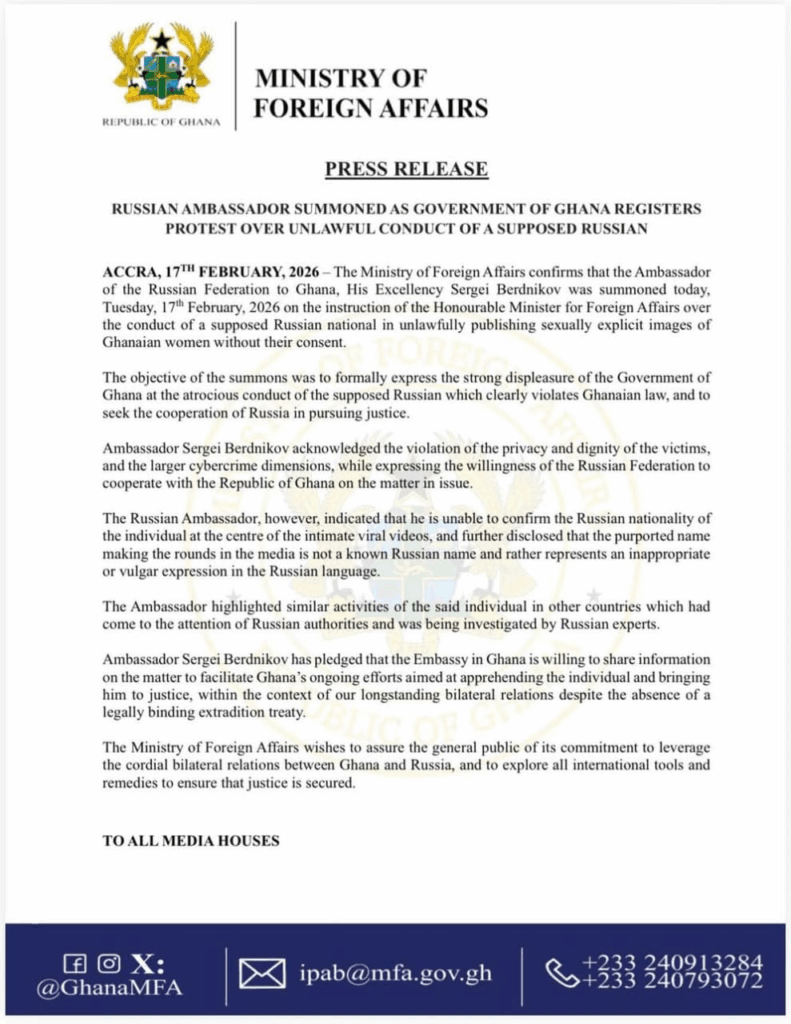 The Foreign Affairs Ministry has summoned the Russian Ambassador to Ghana, Sergei Berdnikov, over what it describes as the unlawful publication of sexually explicit images of Ghanaian women without their consent.