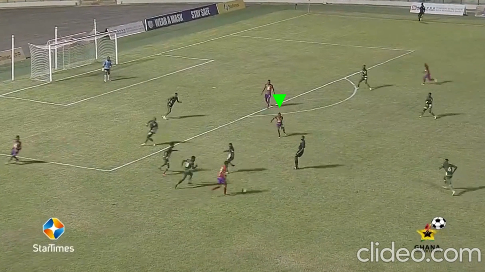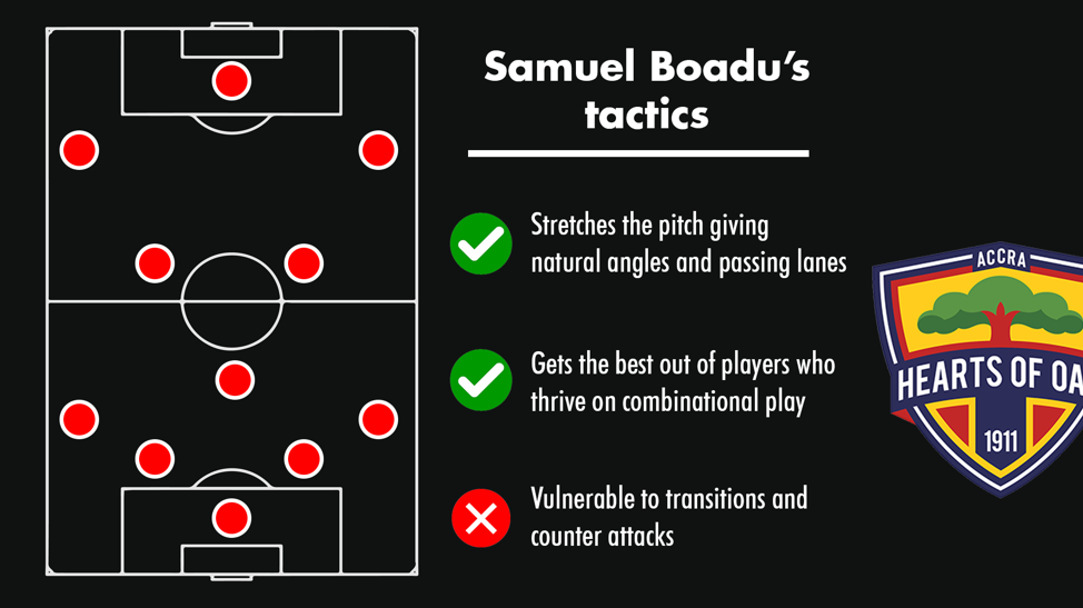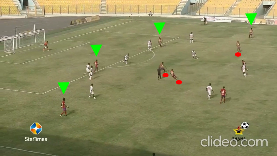 The fact that a lot of Hearts of Oak players are versatile in multiple positions makes it easier. Boadu structures his team to circulate the ball from the back, creating superiority and breaking lines with passes from deep areas to reach the midfield.