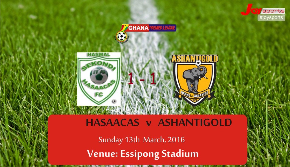 Sekondi Hasaacas were held to a 1-1 draw by champions AshantiGold at the Essipong Stadium.Eric Bekoe fired Hasmal into the lead from the spot in the 53rd minute but defender Kadri Mohammed levelled for the travelers two minutes from time. Ashantigold dominated possession for large portions of the game but it was Hasmal who scored first after a Samuel Afful explosive run from the right forced an AshantiGold defender to handle the ball in the box. Bekoe stepped up to send Robert Dabuo the wrong side for the opener. Ashantigold huffed and puffed for the equalizer and were duly rewarded when Kadri Mohammed rose high to head home a Fuseini Nuhu cross late into the game.