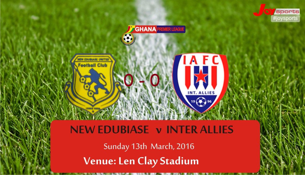 New Edubiase Utd and Inter Allies FC played out a goalless 0-0 draw at the Len Clay Stadium. New Edubiase United dominated both halves of the game but a combination of poor finishing and exceptional goalkeeping by Kwame Baah kept the scoreline barren. A good point for Herbert Addo and Inter Allies but they will sweating over the fitness Ropapa Mensah was substituted in the first half after sustaining an injury ahead of hosting Hearts of Oak next weekend.