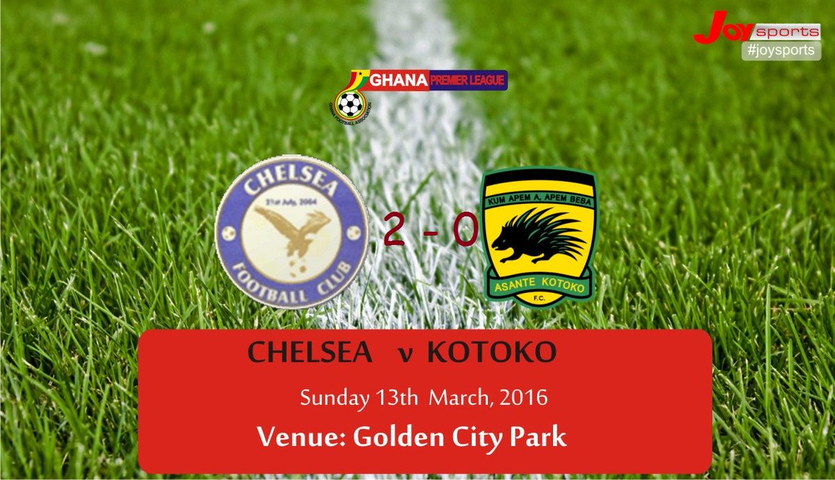 A brace from Sadick Adams ensured Asante Kotoko’s winless continued. Adams scored twice in the space of four minutes to extend Chelsea's unbeaten record at home to 40 games. Kotoko were expected to record a positive result after back to back draws but it was the Blues who dominated the game from the start.The Blues were by far the better side in the first half as they dominated play and made the most of their chances. Sadick Adams twice beat the offside trap to score his second and third goals of the season. Despite upping their game in the second half, Kotoko were unable find the back of the net.