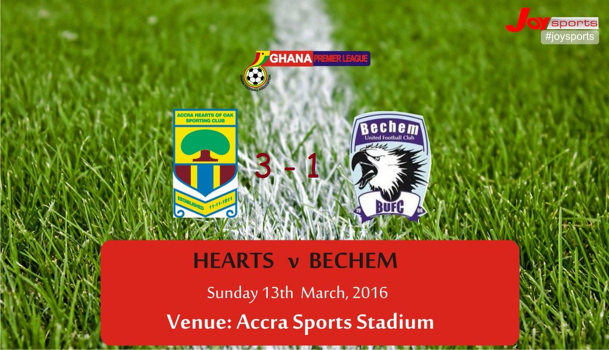 Hearts of Oak produced an impressive performance to beat Bechem United 3-1 at the Accra Sports Stadium. The Phobians did not take long to make their intentions known with two shots on target in the first minute. Despite the bright start, the Phobians had to wait till the 37th minute to take the lead when striker Samuel Yeboah reacted quickest to a loose ball in the penalty area to fire the ball into the net. Hearts got their second in the second half when midfielder Mustapha Esuuman’s shot deflected off Patrick Cole into the net. Two became three when Isaac Mensah fired from six yards after great work from Samuel Yeboah and his partner Cosmos Dauda. The Phobians however conceded their first goal of the campaign when John Nyamekye scored from close range.