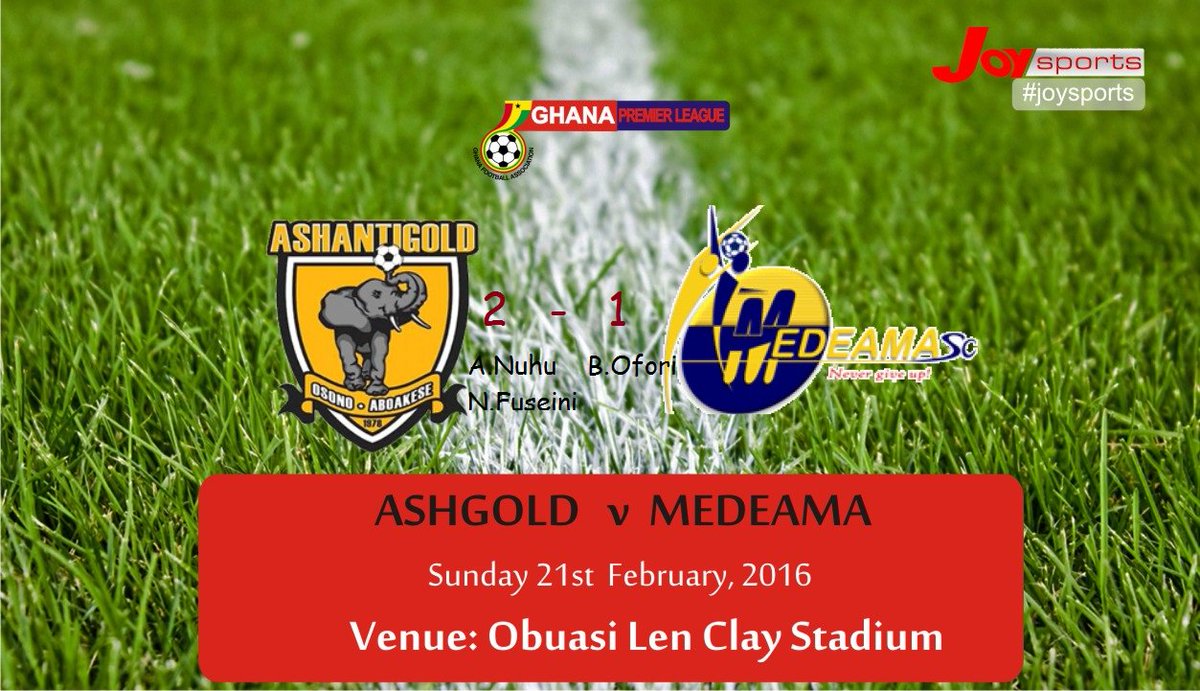 Nuhu Fuseini and Alhassan Nuhu scored in between Bernard Ofori's goal from the spot to hand the Miners a sweet revenge over Medeama.Alhassan Nuhu opened the scoring in the 36th minute before former teammate Bernard Ofori restored parity for Medeama through the spot kick.Nuhu Fuseini proved the winner when he scored a scorcher in the opening minutes of the second half.