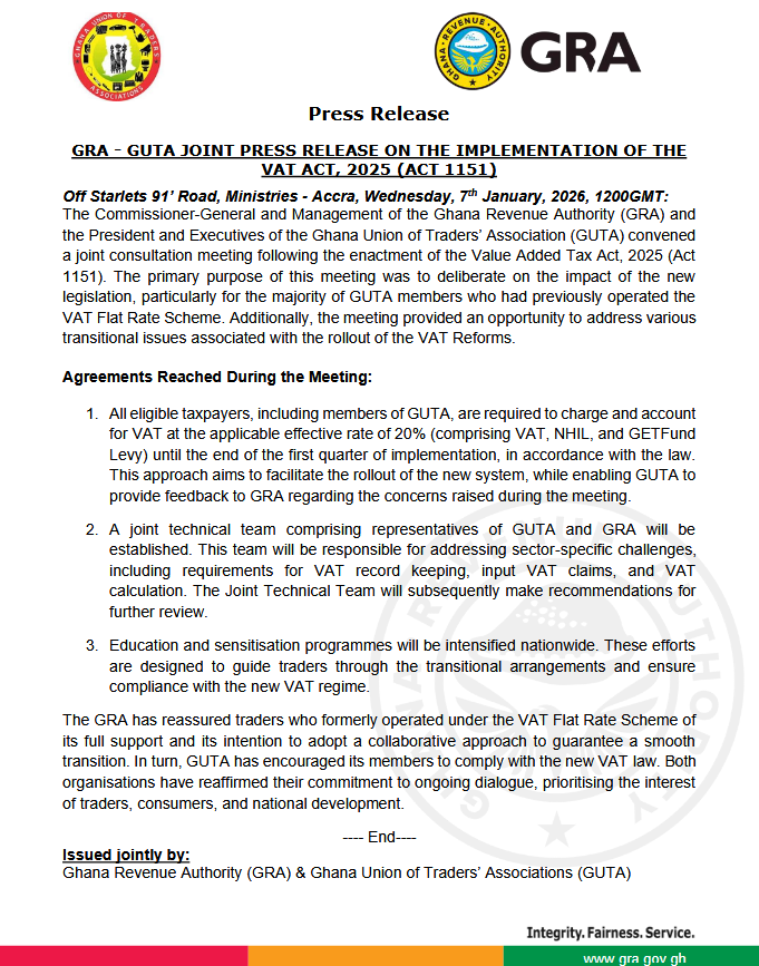 The Ghana Revenue Authority (GRA) and the Ghana Union of Traders’ Associations (GUTA) have reached key agreements to ensure a smooth transition to the newly enacted Value Added Tax Act, 2025 (Act 1151).