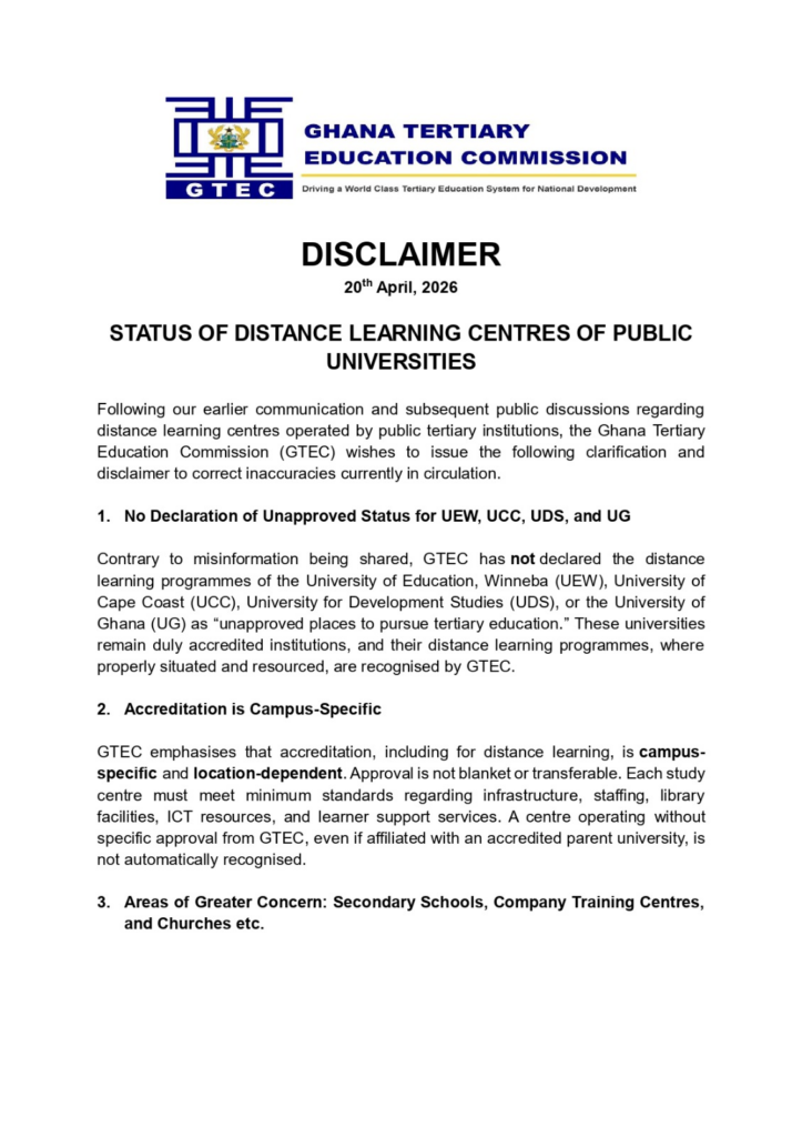 The Ghana Tertiary Education Commission (GTEC) has issued a clarification to correct what it describes as growing inaccuracies and public misunderstanding surrounding the regulation and approval of distance learning centres operated by public universities in Ghana.