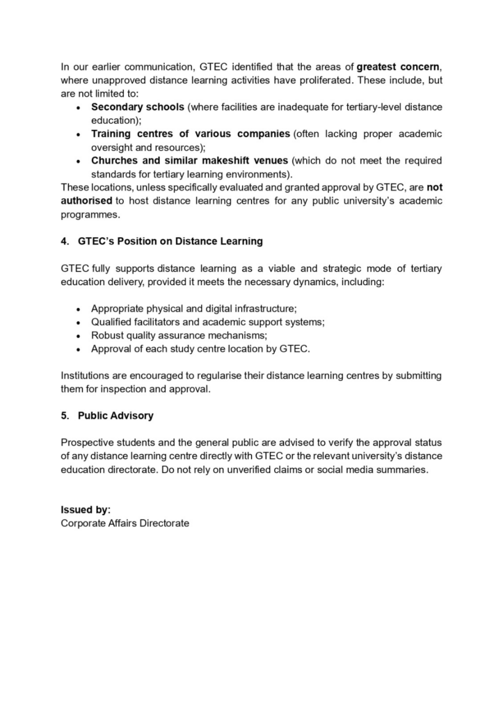 "Prospective students and the general public are advised to verify the approval status of any distance learning centre directly with GTEC or the relevant university’s distance education directorate. They are further advised not to rely on unverified claims or social media summaries," the statement concluded.