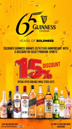 As part of its 65th anniversary celebrations, Guinness Ghana is proud to announce a 15% price reduction on a selection of its premium spirits as a heartfelt gesture of appreciation to the people who have powered its journey over the past six and a half decades.