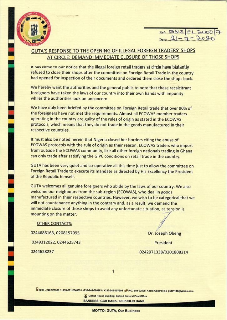 The Ghana Union of Traders’ Association (GUTA) is demanding the closure of shops belonging to illegal foreign traders at Circle in Accra.