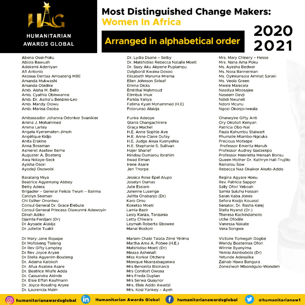 Below is the list of HAG Most Distinguished African Women Change Makers arranged in alphabetical order.