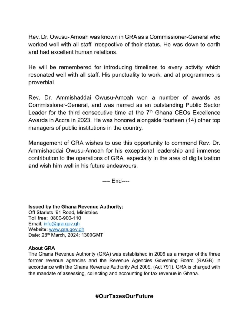 “Management of GRA wishes to use this opportunity to commend Rev. Dr. Ammishaddai Owusu-Amoah for his exceptional leadership and immense contribution to the operations of GRA, especially in the area of digitalization and wish him well in his future endeavours.