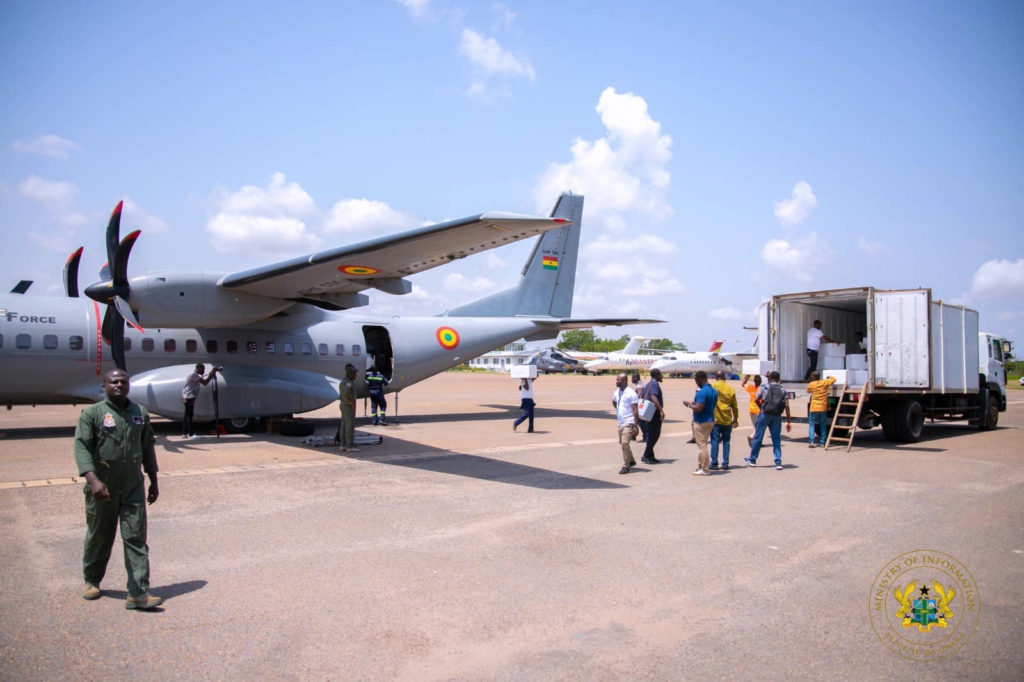 The Information Ministry shared pictures of the GHS receiving the vaccines at the airport noting that they have already begun distributing them to various regions and facilities.