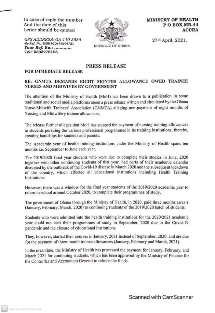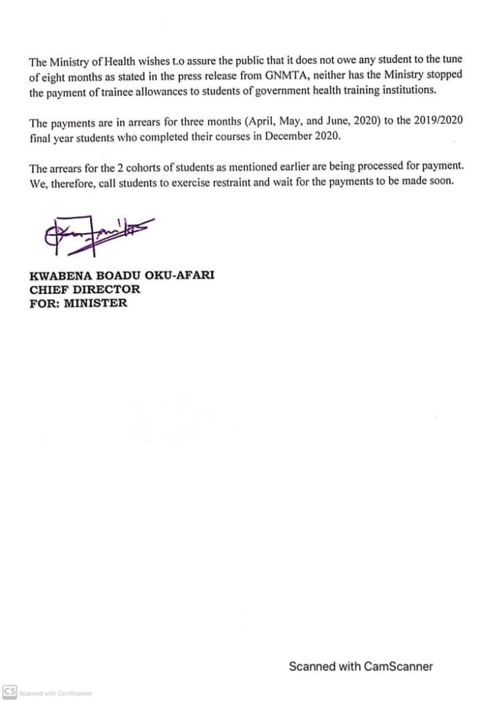 “The Ministry of Health wishes to assure the public that it does not owe any student to the tune of eight months as stated in the press release from GNMTA, neither has the Ministry stopped the payment of trainee allowances to students of government health training institutions."