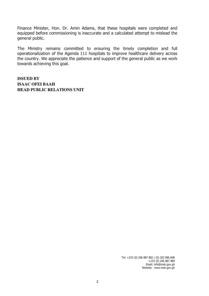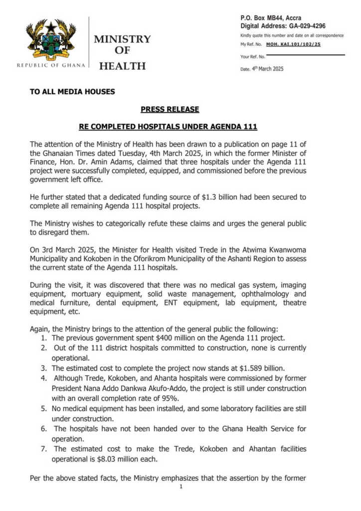The Ministry of Health has strongly refuted claims made by former Minister of Finance, Dr Amin Adams, regarding the status of three hospitals under the Agenda 111 project.