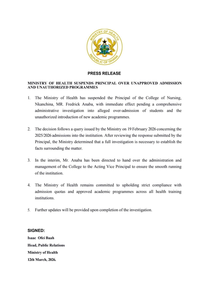 The Ministry of Health (Ghana) has suspended Fredrick Anaba, Principal of the College of Nursing, Nkanchina, over the alleged over-admission of students and the introduction of unapproved academic programmes.