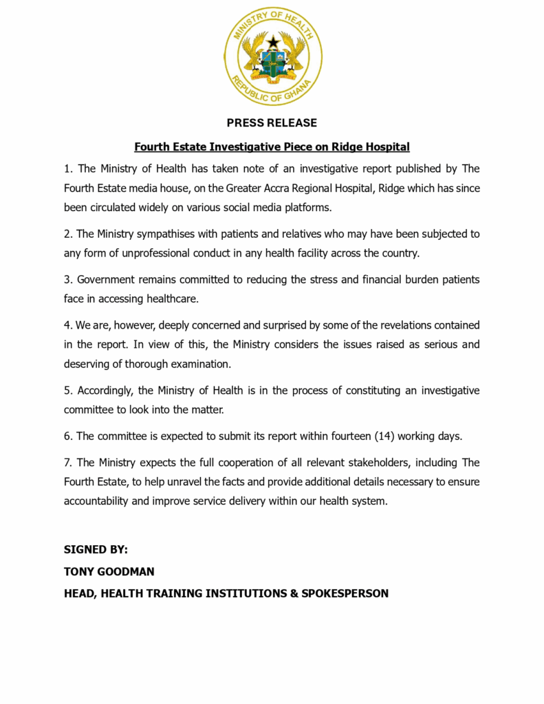 “The Ministry of Health has taken note of an investigative report published by The Fourth Estate media house on the Greater Accra Regional Hospital, Ridge,” the statement said.