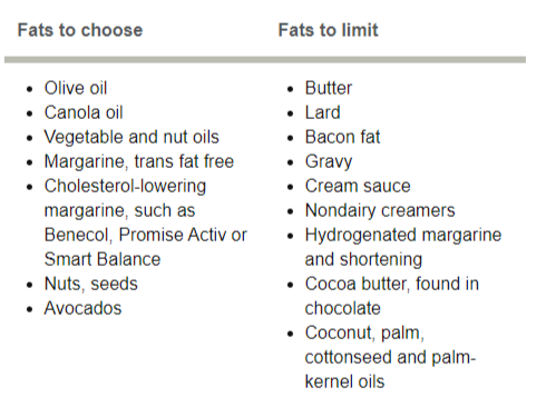 When you do use fats, choose monounsaturated fats, such as olive oil or canola oil. Polyunsaturated fats, found in certain fish, avocados, nuts and seeds, also are good choices for a heart-healthy diet. When used in place of saturated fat, monounsaturated and polyunsaturated fats may help lower your total blood cholesterol. But moderation is essential. All types of fat are high in calories.
