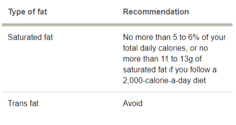 The American Heart Association offers these guidelines for how much fat to include in a heart-healthy diet: