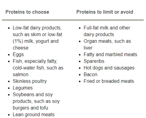 Lean meat, poultry and fish, low-fat dairy products, and eggs are some of your best sources of protein. But be careful to choose lower fat options, such as skim milk rather than whole milk and skinless chicken breasts rather than fried chicken patties.