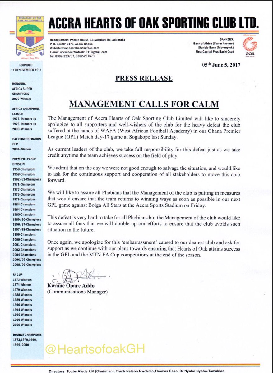The Management of Accra Hearts of Oak Sporting Club Limited will like to sincerely apologize to all supporters and well-wishers of the club for the heavy defeat the club suffered at the hands of West African Football Academy in our Ghana Premier League match-day 17 game at Sogakope last Sunday.