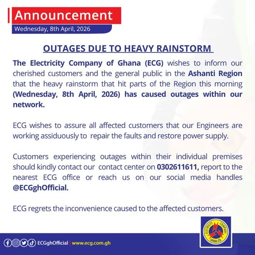 The Electricity Company of Ghana (ECG) has informed customers in the Ashanti Region and the general public that a severe rainstorm which struck parts of the region on the morning of Wednesday, April 8, 2026, has resulted in power outages across the network.
