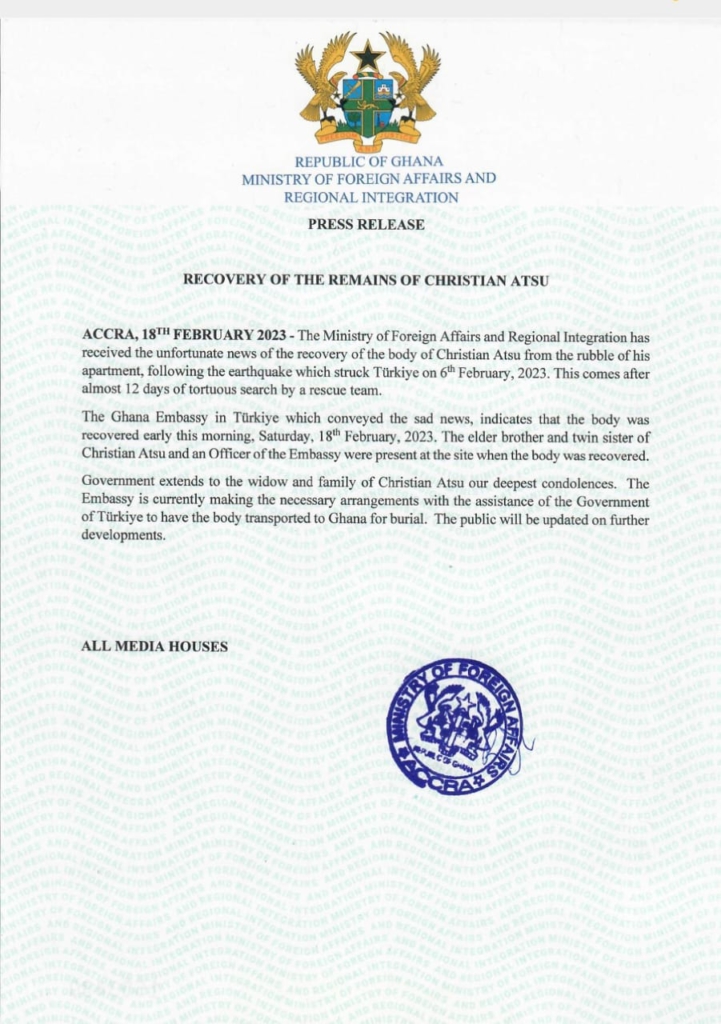 I extend sincere, heartfelt condolences to the widow, children and family of our fellow Ghanaian, Christian Atsu, on the sad news of his death. Ghana football has lost one of its finest personnel and ambassadors, one who will be difficult to replace. He’ll be sorely missed. 1/2 pic.twitter.com/CqTkEsY4Op