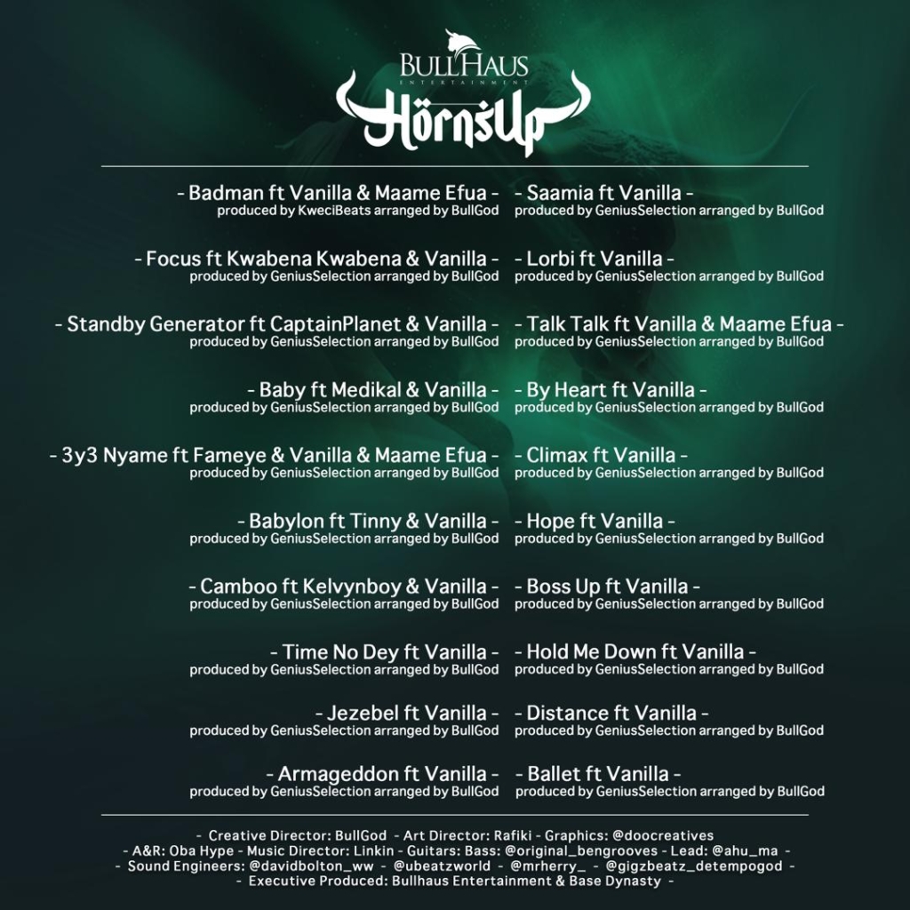 The twenty-track album features Vanilla and top musicians such as Tinny, Fameye, Medikal, Kwabena Kwabena, Captain Planet 4X4 and Kelvynboy.