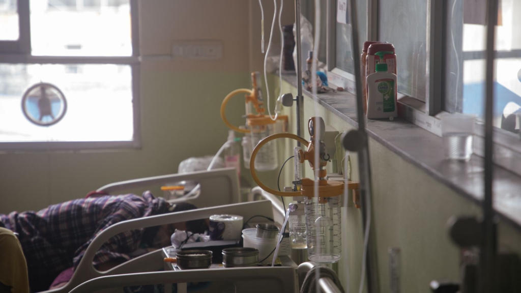 The Sukraraj Tropical Infections Hospital is full. A makeshift COVID-19 facility has been made outside, which is also overflowing. Patients are attached to oxygen cylinders awaiting their turn for a bed inside while doctors and nurses attend to them and monitor critical levels.