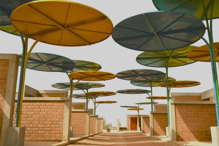 Her design for a market in the remote village of Dandaji, which includes colorful recycled metal canopies surrounding a sacred tree, has become a vital space for vendors in the region to do trade.